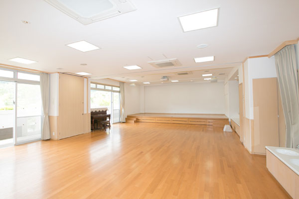 『 遊戯室 』はみんなのお部屋遊戯室は、様々な活動に欠かせないお部屋です。普段はここで伸び伸びと遊びます。また、合同誕生会や四季折々の行事などでは園児みんながここに楽しく集います。 -